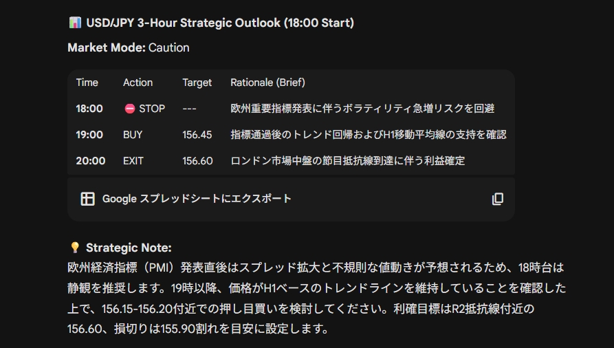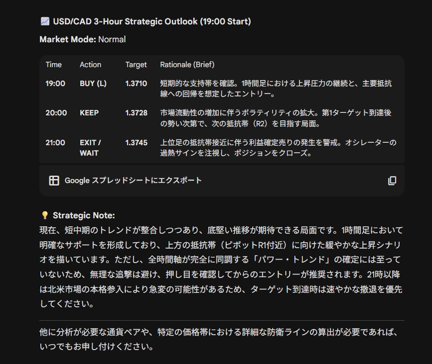 提示される3時間ごとのアクションプランにはエントリー価格だけでなくターゲットとなるピボットポイントや出口戦略までが含まれています。